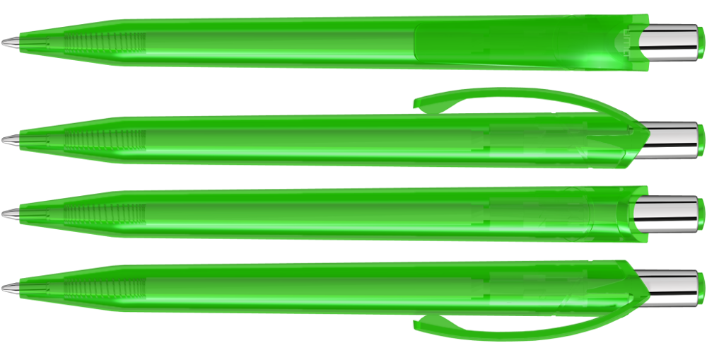 Druckkugelschreiber mit glänzend transparentem Gehäuse und Drückerstopfen. Drücker in silber glänzend.