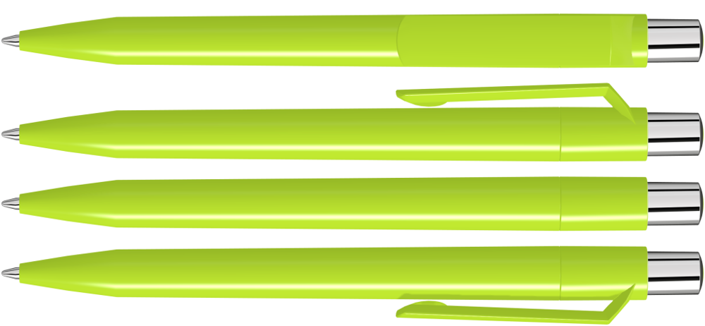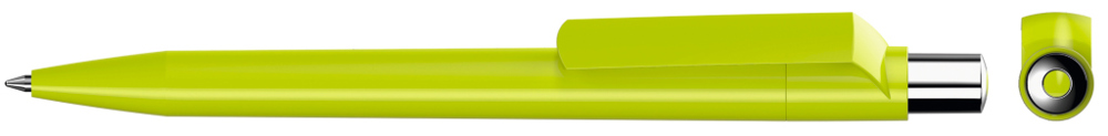 Druckkugelschreiber mit farbig gedeckt glänzendem Gehäuse, silber glänzendem Drücker und farbigem Stopfen.