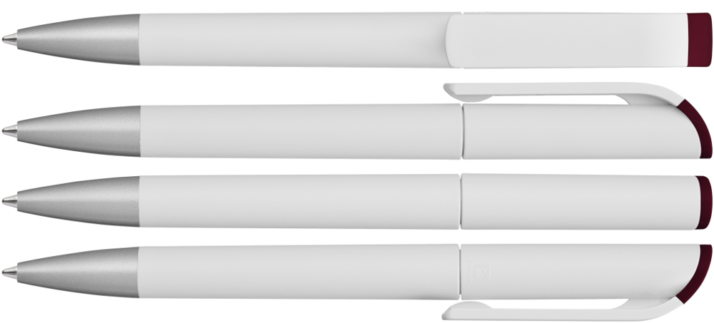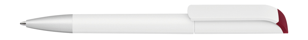 Drehkugelschreiber mit gedeckt mattem Gehäuse in weiß, farbig glänzendem Stopfen und Spitze silber matt.