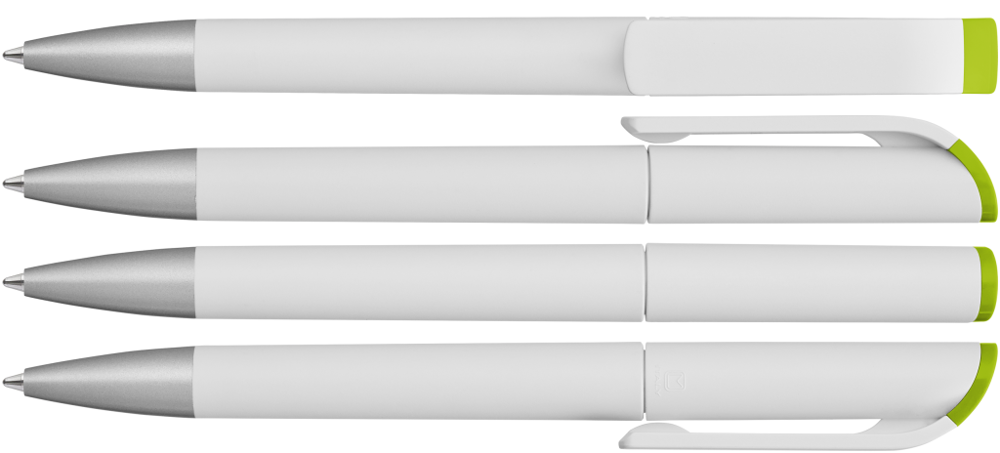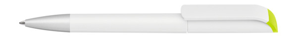 Drehkugelschreiber mit gedeckt mattem Gehäuse in weiß, farbig glänzendem Stopfen und Spitze silber matt.