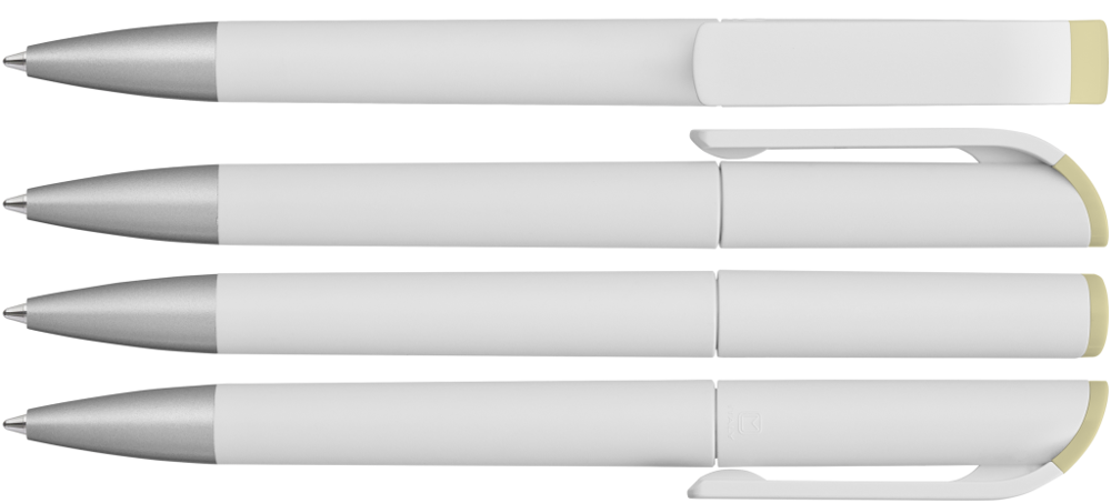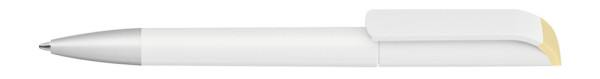 Drehkugelschreiber mit gedeckt mattem Gehäuse in weiß, farbig glänzendem Stopfen und Spitze silber matt.