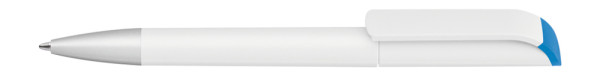 Drehkugelschreiber mit gedeckt mattem Gehäuse in weiß, farbig glänzendem Stopfen und Spitze silber matt.