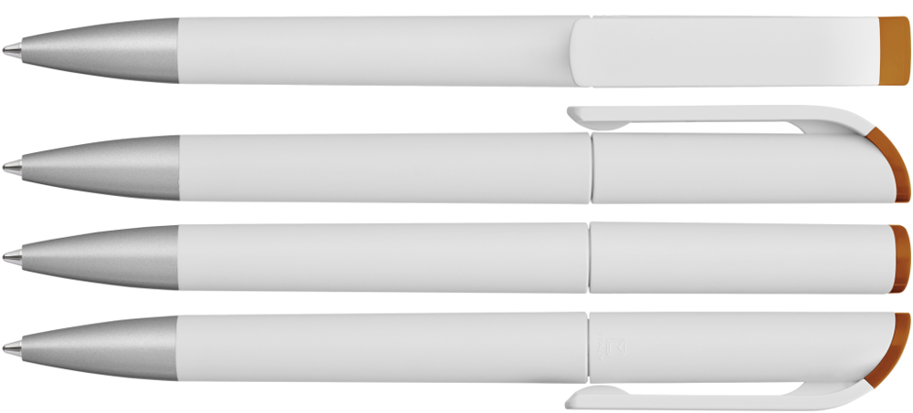 Drehkugelschreiber mit gedeckt mattem Gehäuse in weiß, farbig glänzendem Stopfen und Spitze silber matt.