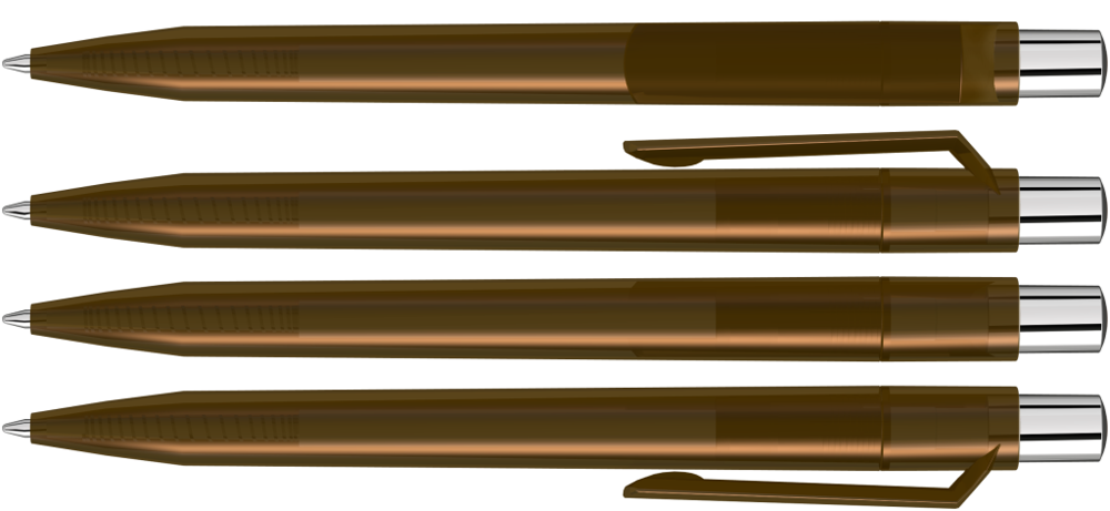 Druckkugelschreiber mit transparent glänzendem Gehäuse, silber glänzendem Drücker und farbigem Stopfen.