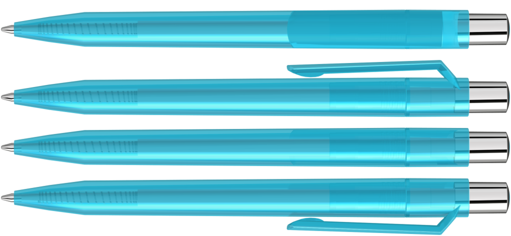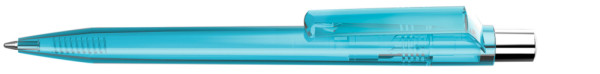 Druckkugelschreiber mit transparent glänzendem Gehäuse, silber glänzendem Drücker und farbigem Stopfen.