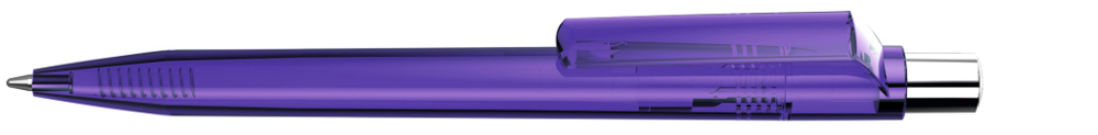 Druckkugelschreiber mit transparent glänzendem Gehäuse, silber glänzendem Drücker und farbigem Stopfen.