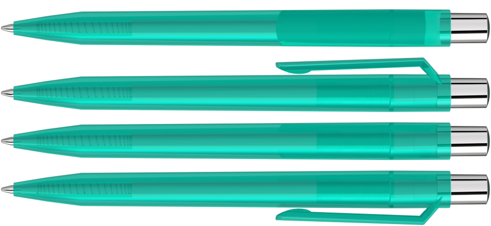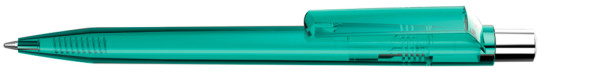 Druckkugelschreiber mit transparent glänzendem Gehäuse, silber glänzendem Drücker und farbigem Stopfen.