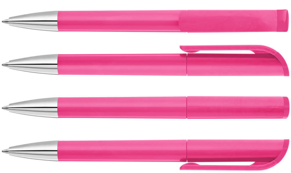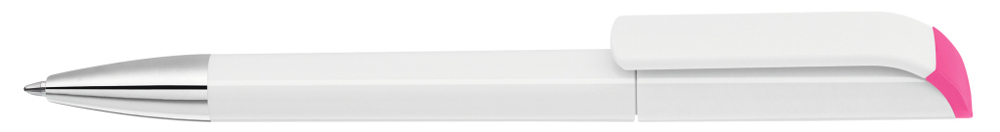 Drehkugelschreiber mit gedeckt glänzendem Gehäuse in weiß, farbig glänzendem Stopfen und Spitze glanzverchromt.