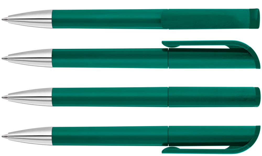Drehkugelschreiber mit gedeckt glänzendem Gehäuse in weiß, farbig glänzendem Stopfen und Spitze glanzverchromt.