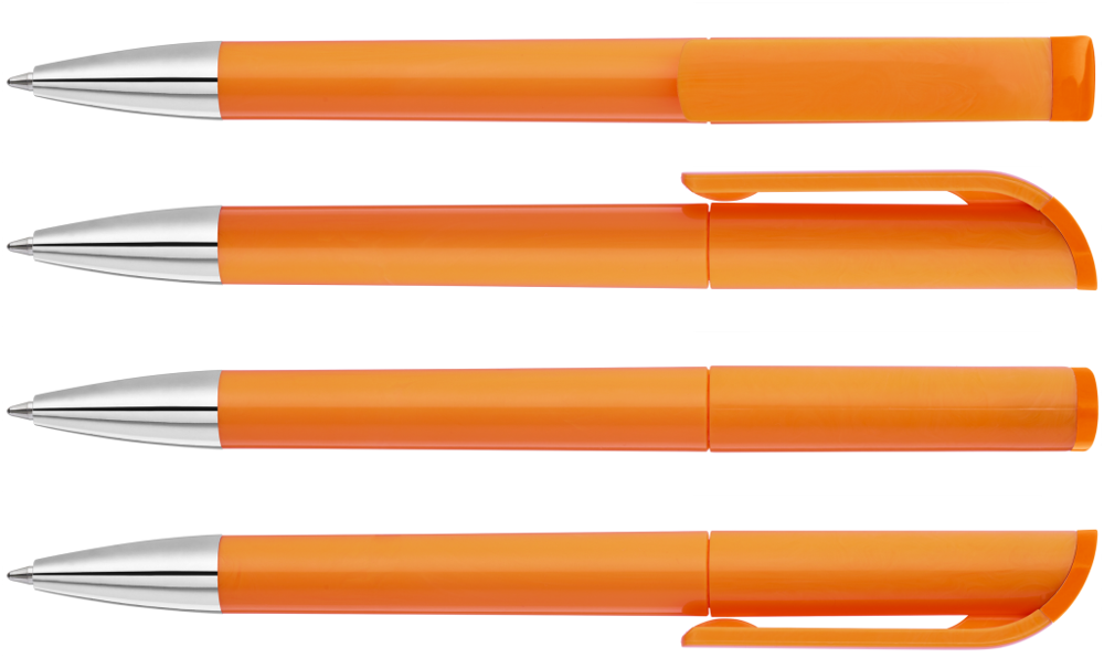 Drehkugelschreiber mit gedeckt glänzendem Gehäuse in weiß, farbig glänzendem Stopfen und Spitze glanzverchromt.