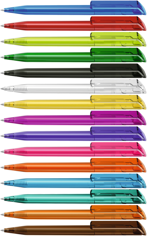 Drehkugelschreiber mit transparent glänzendem Gehäuse. mehr