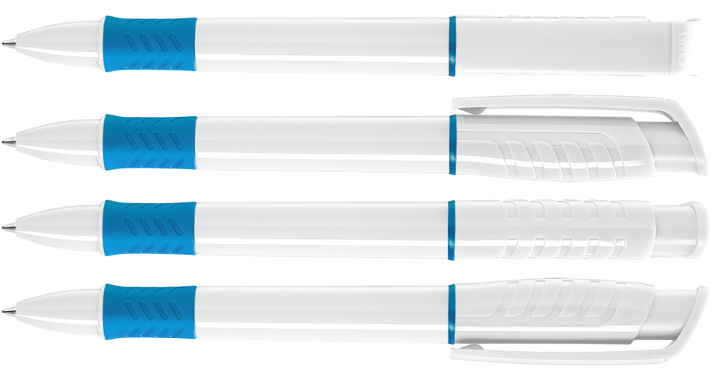 Druckkugelschreiber mit gedeckt glänzendem Gehäuse in weiß, Griffzone und Zierring farbig oder unifarben gedeckt glänzend schwarz.