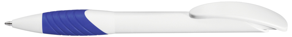 Druckkugelschreiber mit gedeckt mattem Gehäuse, Bogenclipdrücker und Spitze in weiß, ergonomische, farbige Gummigriffzone.