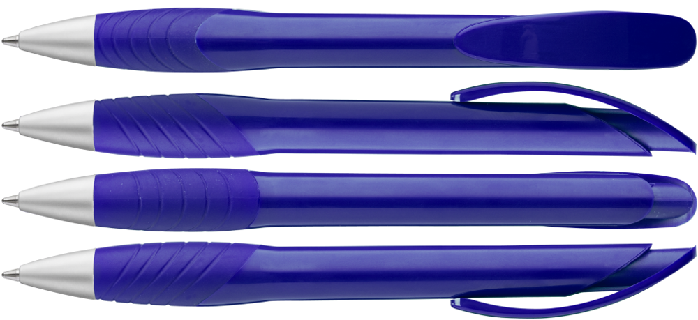 Druckkugelschreiber mit gedeckt glänzendem Gehäuse, Bogenclipdrücker, ergonomische Gummigriffzone und Metallspitze matt verchromt.