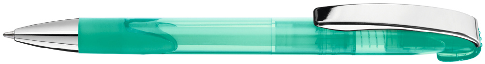 Druckkugelschreiber mit transparent glänzendem Gehäuse, Gummigriffzone, schwerer Metallspitze und Metallclip glanzverchromt.