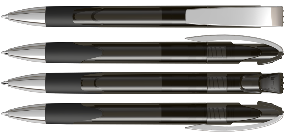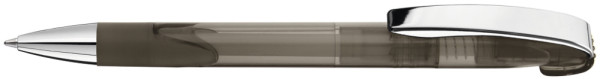 Druckkugelschreiber mit transparent glänzendem Gehäuse, Gummigriffzone, schwerer Metallspitze und Metallclip glanzverchromt.