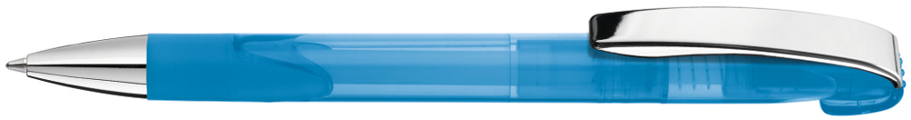 Druckkugelschreiber mit transparent glänzendem Gehäuse, Gummigriffzone, schwerer Metallspitze und Metallclip glanzverchromt.