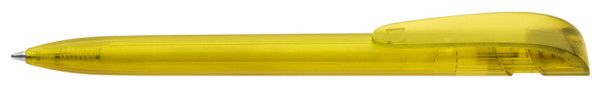 Druckkugelschreiber mit transparent glänzendem Gehäuse und breitem Bogenclipdrücker.