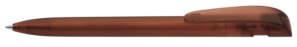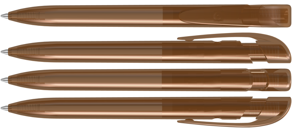 Druckkugelschreiber mit transparent glänzendem Gehäuse und breitem Bogenclipdrücker.