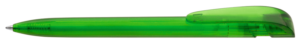 Druckkugelschreiber mit transparent glänzendem Gehäuse und breitem Bogenclipdrücker.