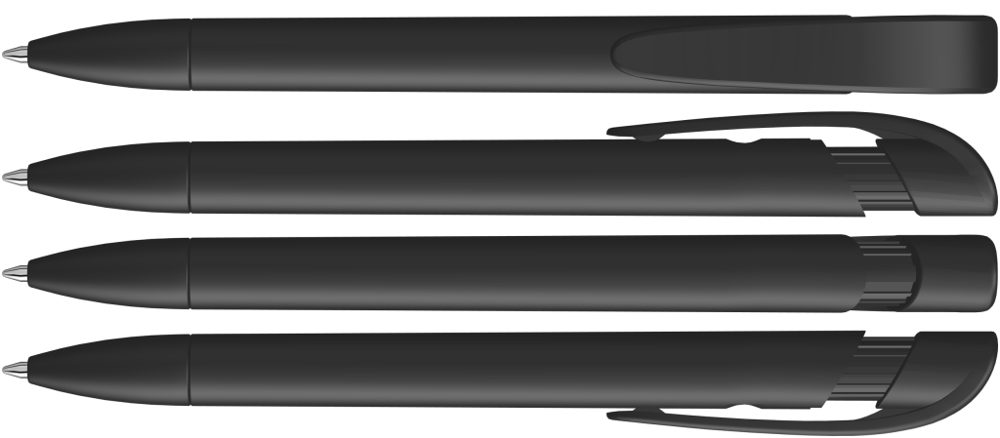 Druckkugelschreiber mit gedeckt mattem Gehäuse, breitem Bogenclipdrücker und Spitze.