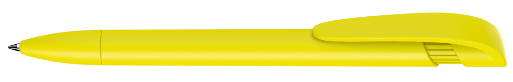 Druckkugelschreiber mit gedeckt mattem Gehäuse, breitem Bogenclipdrücker und Spitze.