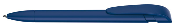 Druckkugelschreiber mit gedeckt mattem Gehäuse, breitem Bogenclipdrücker und Spitze.