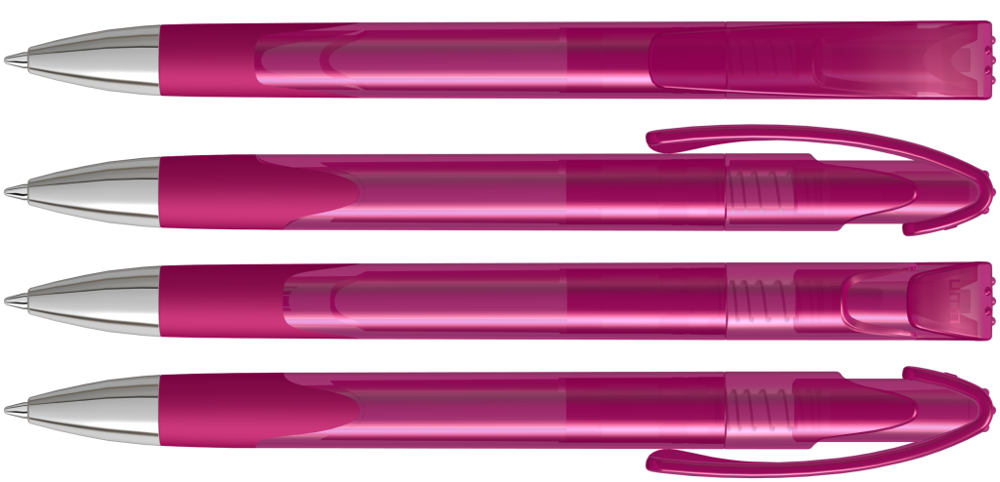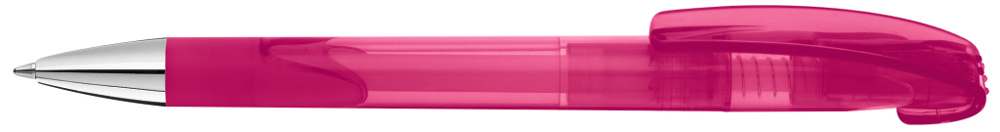 Druckkugelschreiber mit transparent glänzendem Gehäuse, Gummigriffzone und schwerer Metallspitze glanzverchromt.