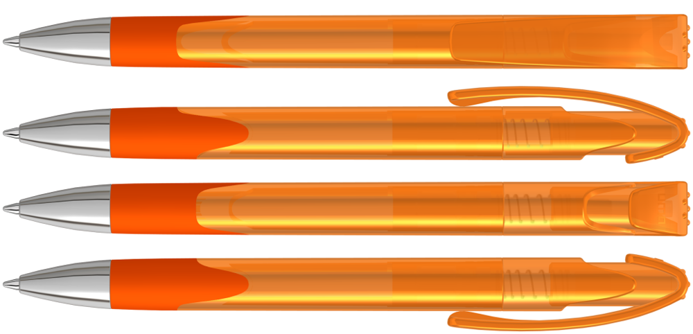 Druckkugelschreiber mit transparent glänzendem Gehäuse, Gummigriffzone und schwerer Metallspitze glanzverchromt.