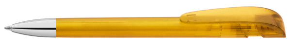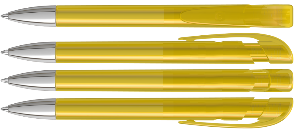 Druckkugelschreiber mit transparent glänzendem Gehäuse, breitem Bogenclipdrücker und schwerer Metallspitze glanzverchromt.