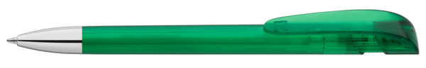 Druckkugelschreiber mit transparent glänzendem Gehäuse, breitem Bogenclipdrücker und schwerer Metallspitze glanzverchromt.