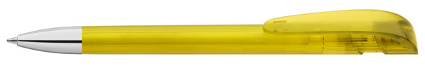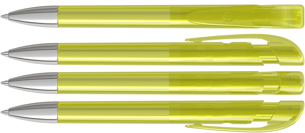 Druckkugelschreiber mit transparent glänzendem Gehäuse, breitem Bogenclipdrücker und schwerer Metallspitze glanzverchromt.