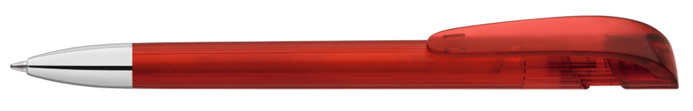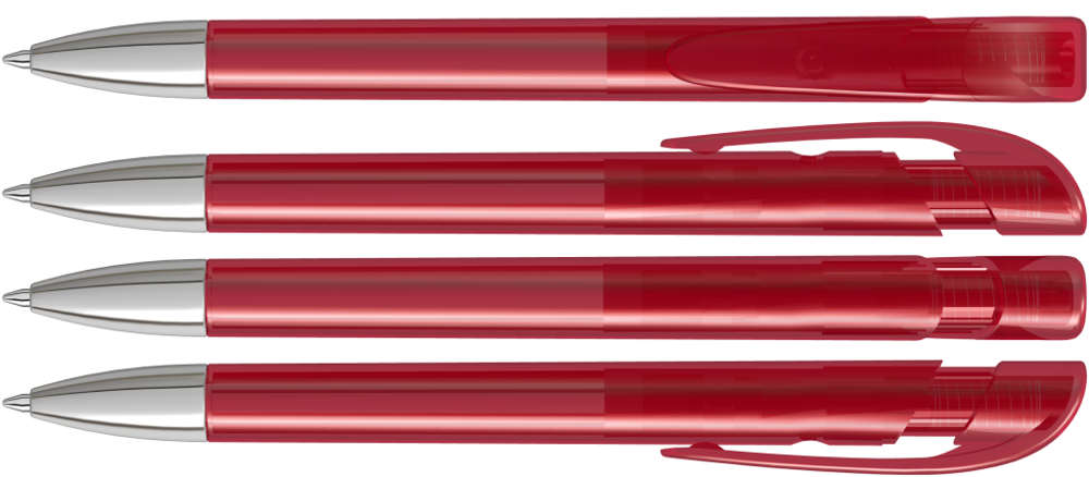 Druckkugelschreiber mit transparent glänzendem Gehäuse, breitem Bogenclipdrücker und schwerer Metallspitze glanzverchromt.