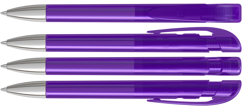 Druckkugelschreiber mit transparent glänzendem Gehäuse, breitem Bogenclipdrücker und schwerer Metallspitze glanzverchromt.
