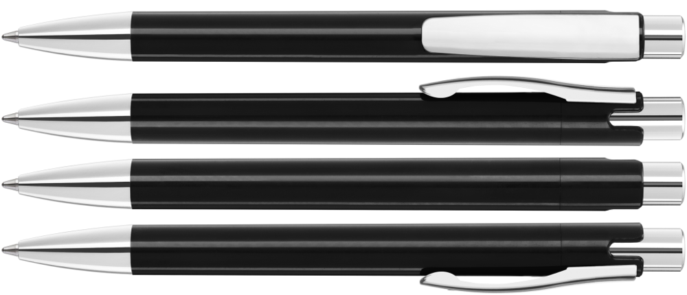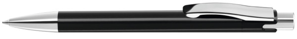 Druckkugelschreiber mit gedeckt glänzendem Gehäuse, schwerer Metallspitze, Metalldrücker und Metallclip glanzverchromt.
