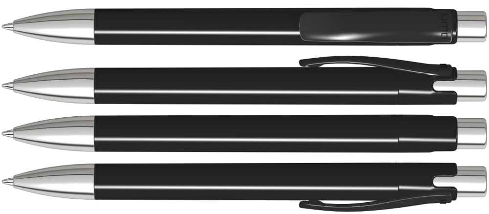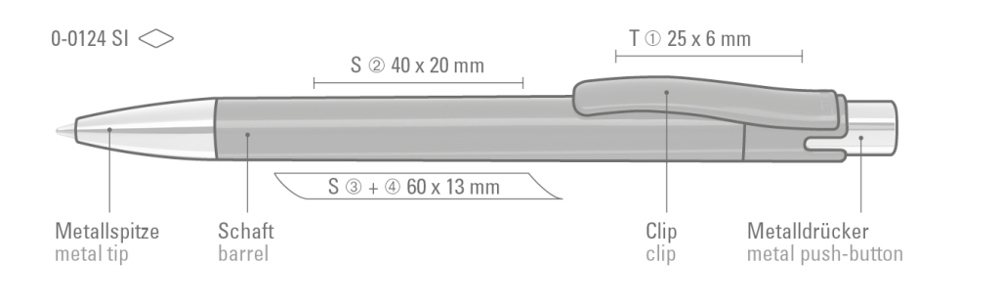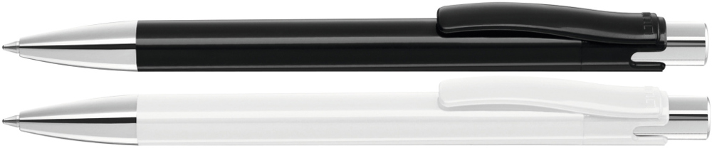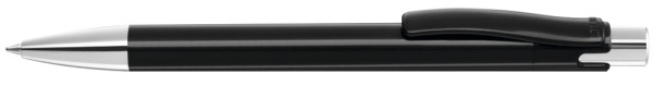 Druckkugelschreiber mit gedeckt glänzendem Gehäuse, Metalldrücker und schwerer Metallspitze glanzverchromt.
