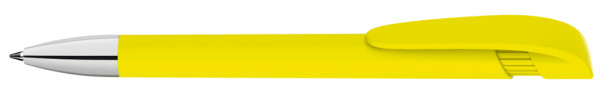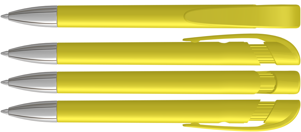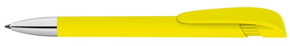 Druckkugelschreiber mit gedeckt mattem Gehäuse, breitem Bogenclipdrücker und silberner Spitze glanzverchromt.
