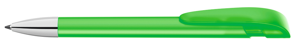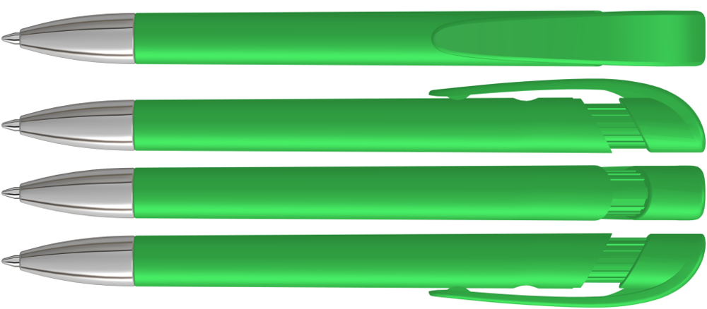 Druckkugelschreiber mit gedeckt mattem Gehäuse, breitem Bogenclipdrücker und silberner Spitze glanzverchromt.