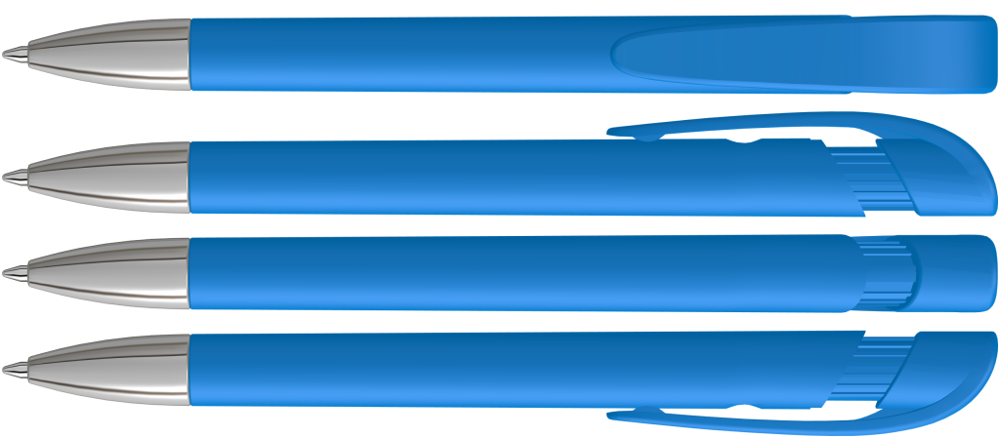 Druckkugelschreiber mit gedeckt mattem Gehäuse, breitem Bogenclipdrücker und silberner Spitze glanzverchromt.