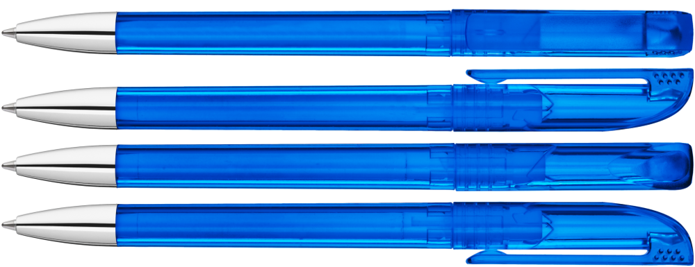 Drehkugelschreiber mit transparent glänzendem Gehäuse, gefrosteter Clipoberfläche und Spitze glanzverchromt.