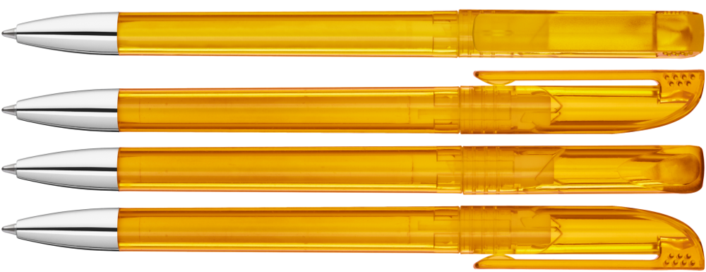 Drehkugelschreiber mit transparent glänzendem Gehäuse, gefrosteter Clipoberfläche und Spitze glanzverchromt.