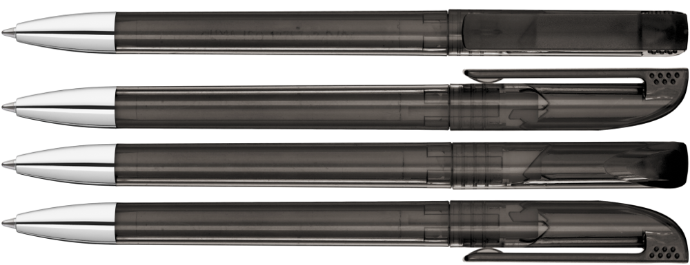 Drehkugelschreiber mit transparent glänzendem Gehäuse, gefrosteter Clipoberfläche und Spitze glanzverchromt.