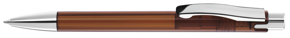 Druckkugelschreiber mit transparent glänzendem Gehäuse, schwerer Metallspitze, Metalldrücker und Metallclip glanzverchromt.
