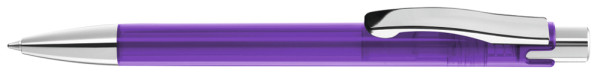 Druckkugelschreiber mit transparent glänzendem Gehäuse, schwerer Metallspitze, Metalldrücker und Metallclip glanzverchromt.