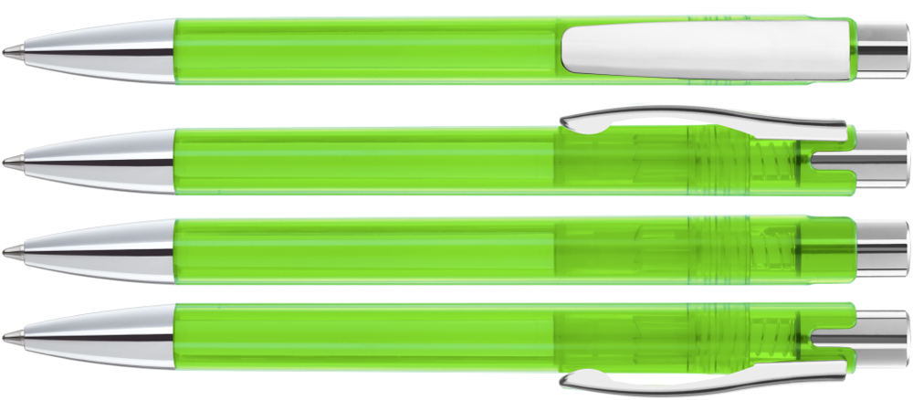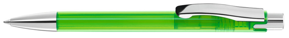 Druckkugelschreiber mit transparent glänzendem Gehäuse, schwerer Metallspitze, Metalldrücker und Metallclip glanzverchromt.