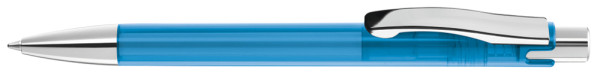 Druckkugelschreiber mit transparent glänzendem Gehäuse, schwerer Metallspitze, Metalldrücker und Metallclip glanzverchromt.