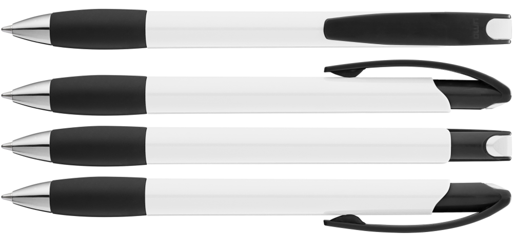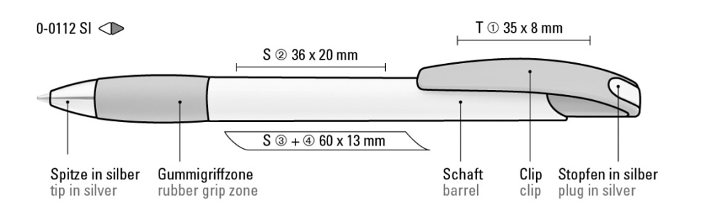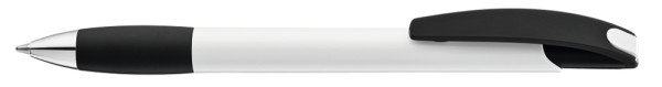 Druckkugelschreiber mit gedeckt glänzendem Gehäuse in weiß, farbiger Gummigriffzone und Clipdrücker. Drückerstopfen und Spitze in silber glänzend.