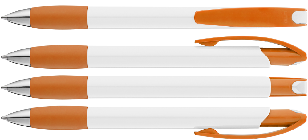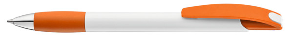 Druckkugelschreiber mit gedeckt glänzendem Gehäuse in weiß, farbiger Gummigriffzone und Clipdrücker. Drückerstopfen und Spitze in silber glänzend.
