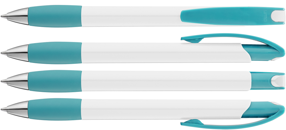 Druckkugelschreiber mit gedeckt glänzendem Gehäuse in weiß, farbiger Gummigriffzone und Clipdrücker. Drückerstopfen und Spitze in silber glänzend.