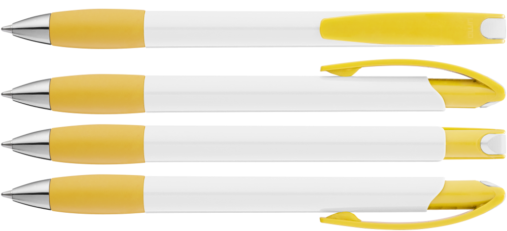 Druckkugelschreiber mit gedeckt glänzendem Gehäuse in weiß, farbiger Gummigriffzone und Clipdrücker. Drückerstopfen und Spitze in silber glänzend.